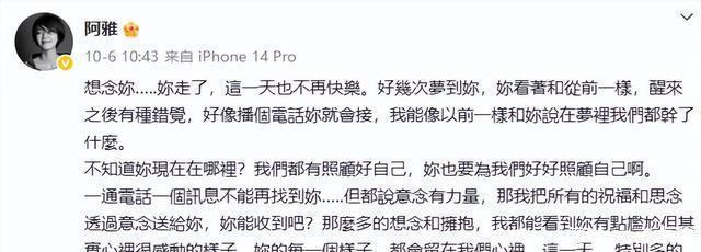 俗话说“家丑不可外扬”,尤其是她们还是公众人物,但凡一个不好,舆论的剑就会割到自己身上。 而这一点,从大小S被全网黑,声名狼藉就能看出来。 阿雅追忆挚友,两家人各有新生活 大S离世后的第一个生日,也就是10月6日,阿雅写下长文追忆她。 字里行间满是对挚友的思念,那些一起疯、一起哭的青春时光,成了阿雅心里抹不去的温暖。