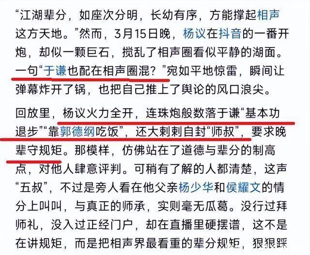 于谦被罚款的这件事,又让人想起了前段时间,杨议对于谦所进行了控诉,这件事在当时可是闹得沸沸扬扬。 在一次直播的过程之中,杨议突然对于谦“开炮”,一句“于谦也配在相声圈混?”掀起了轩然大波。 在这句话之后,杨议面对多位网友的指责,并没有停下自己的控诉,反而开始越说越上劲,数落于谦的“基本功退步”,大不如从前,“靠郭德纲吃饭”,还自封是“师叔”要求晚辈去受规矩。